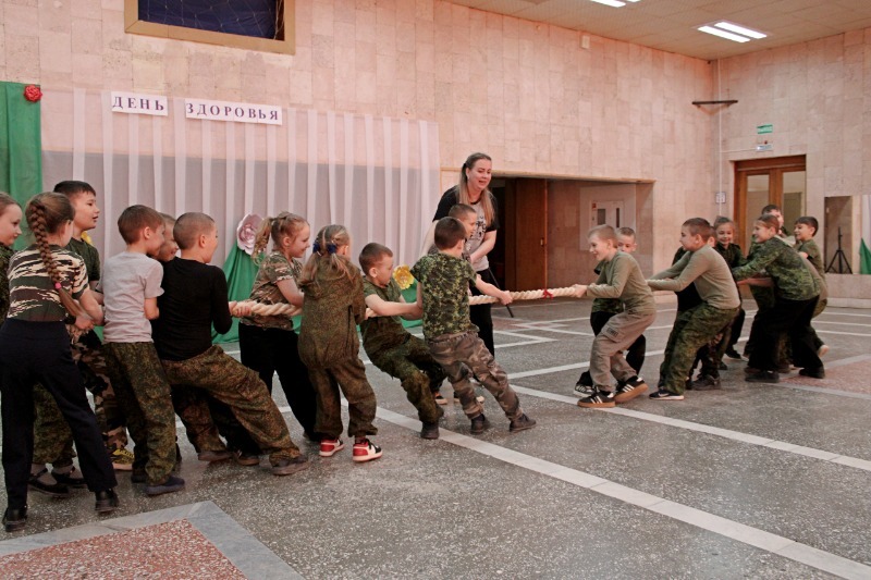 Ну а затем перешли к активным занятиям! Школьникам предложили такие спортивные состязания, как «Кенгуру», «Прокати мяч змейкой», «Мяч над головой», «Ровная осанка», «Перетягивание каната» и т.д.